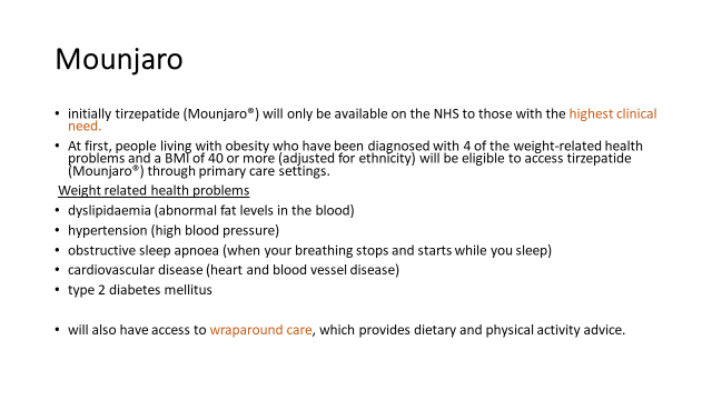 We are losing this fight against fat, but for those that really have tried everything, the big guns of “Big Pharma” are repurposing their arsenal of diabetic injections to join this fight. The most effective of the current crop is Mounjaro, and this will be available on a limited roll out programme in general practice shortly. The initial criteria will be very strict. We have included the slides from a presentation to our clinicians about this for your information.