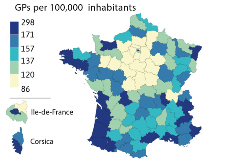 Once again, even if some patients struggle to contact a General Practice for an appointment, the UK seems to have more access to general practitioners than our nearest neighbour. France is really suffering from GP shortages, especially in the rural heart lands where they have less than a third of the GPs that we have in the UK. Even the “most doctored” areas have less GPs per 100,000 patients than the US and UK. If you are venturing across the channel this summer, remember to take sufficient medications on holiday.